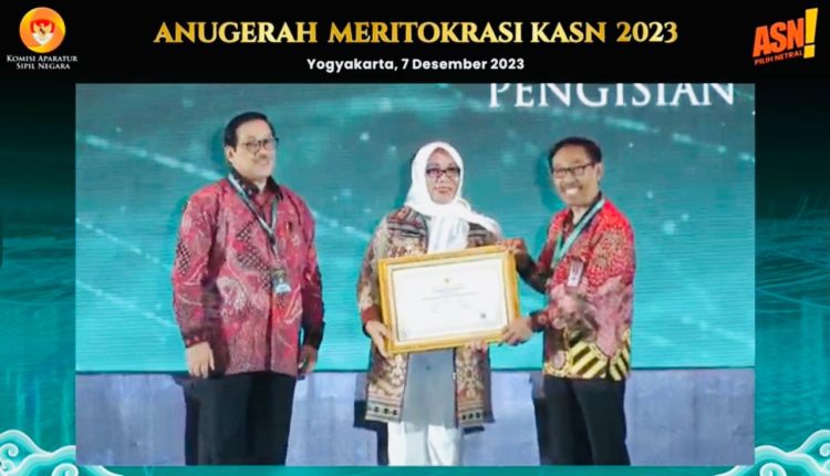 Penghargaan yang diberikan Ketua KASN, Agus Pramusinto di Yogyakarta, Kamis (7/12/2023) hari ini diterima langsung oleh Penjabat (Pj) Wali Kota Pangkalpinang, Lusje Anneke Tabalujan.