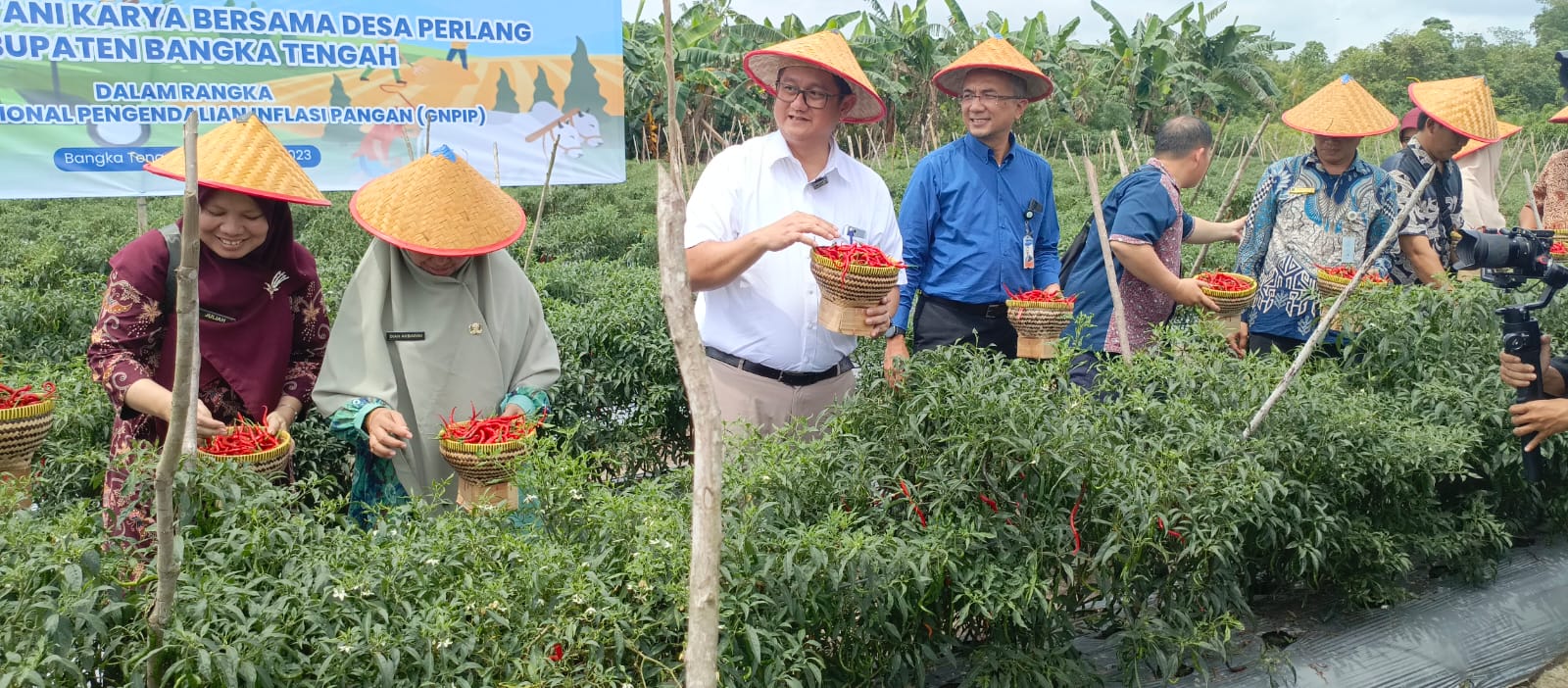 Bank Indonesia turut menyaksikan panen tersebut dan menyambut baik upaya pemerintah Kabupaten Bangka Tengah dalam meningkatkan produksi cabai lokal, di tengah tren kenaikan harga cabai yang per hari ini (7/12) mencapai Rp103.150. Bangka Tengah merupakan salah satu kabupaten yang menjadi sentra hortikultura dan memiliki peran strategis sebagai pemasok terdekat dengan Kota Pangkalpinang yang dihitung inflasinya oleh BPS. Wakil Bupati Bangka Tengah, Era Susanto, turut hadir dalam panen bersama. Dalam sambutannya, Era Susanto menyampaikan dukungan terhadap program pengendalian inflasi serta mengarahkan pemetaan pengembangan komoditas unggulan di setiap desa di Bangka Tengah.