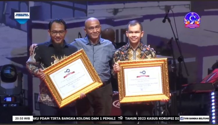 Penyerahan penghargaan diserahkan langsung oleh Kepala Stasiun TVRI Bangka Belitung, Sriwidayat kepada Plt Kepala Diskominfo, Yuri Siswanto di halaman kantor TVRI Bangka Belitung.