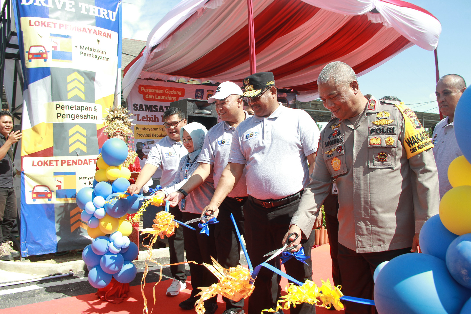 Kepala Cabang PT Jasa Raharja Kepulauan Bangka Belitung Arny Irawati Tenriajeng, bersama PJ Gubernur Provinsi Kepulauan Bangka Belitung Dr Safrizal Zakaria Ali dan Wakapolda Kepulauan Bangka Belitung Brigjen Pol Drs Sugeng Suprijanto, didampingi oleh Dirlantas Polda Kepulauan Bangka Belitung Kombes Pol Juang Andi Priyanto, dan Kepala Bakuda Provinsi Kepulauan Bangka Belitung M. Haris, bersama-sama melakukan pemotongan pita sebagai tanda peluncuran layanan Samsat Drive Thru.