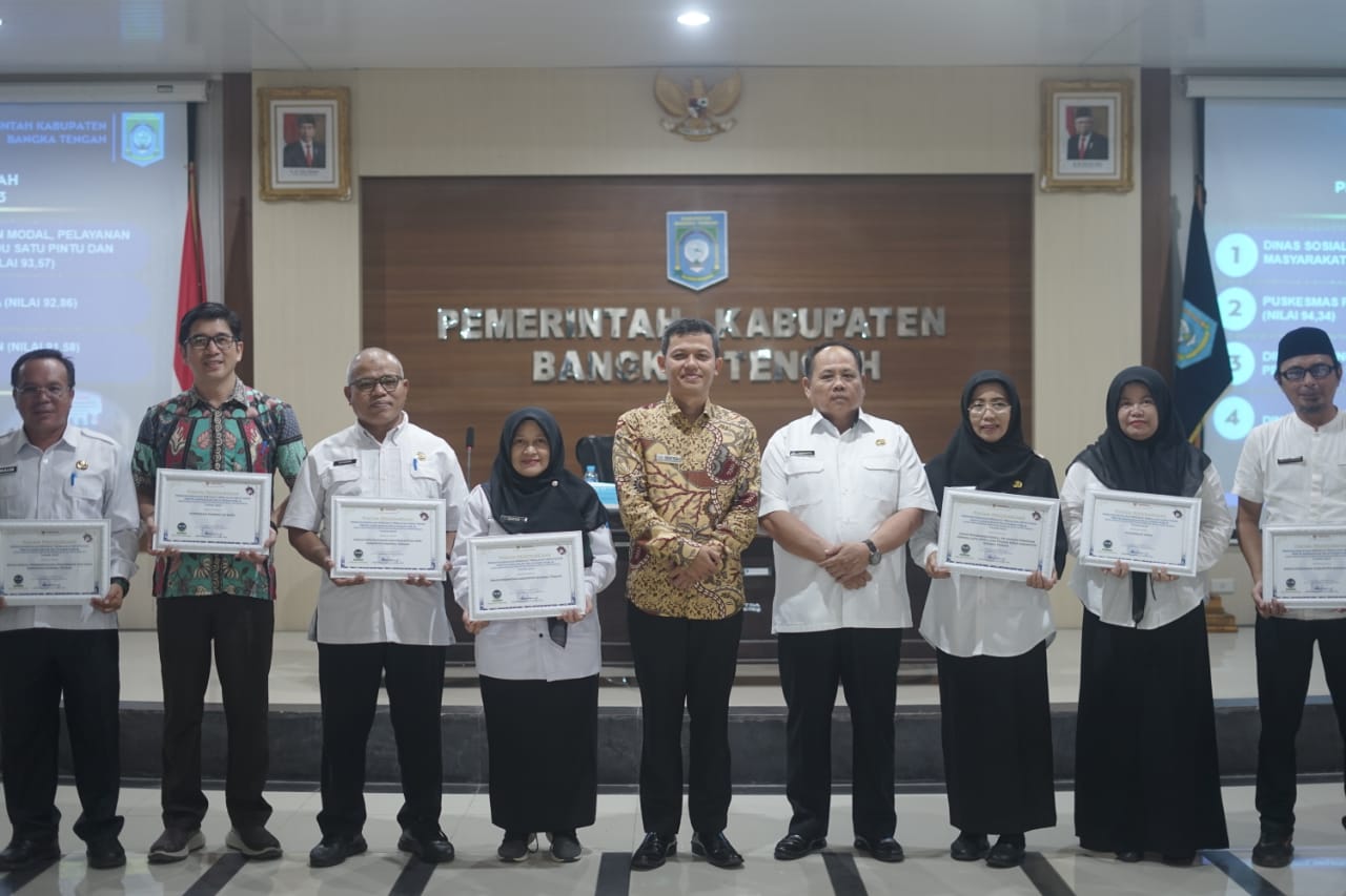 TerabasNews,BANGKA TENGAH – Pemerintah Daerah Kabupaten Bangka Tengah meraih nilai tertinggi dengan nilai 93,71 dari Ombudsman RI Bangka Belitung, tingkat Kabupaten-Kota se Bangka Belitung, dan peringkat 46 Nasional pada kepatuhan Penyelenggaraan Pelayanan Publik 2023.