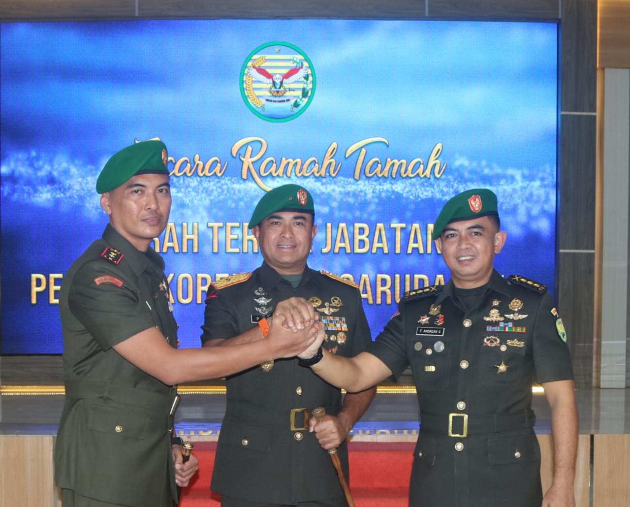 pada hari ini kita dapat mengikuti acara tradisi satuan dan serah terima jabatan Kasipers Kasrem 045/Garuda Jaya, Dandim 0413/Bangka dan penyerahan jabatan Kasiter Kasrem 045/Gaya, dalam keadaan sehat Waalfiat.
