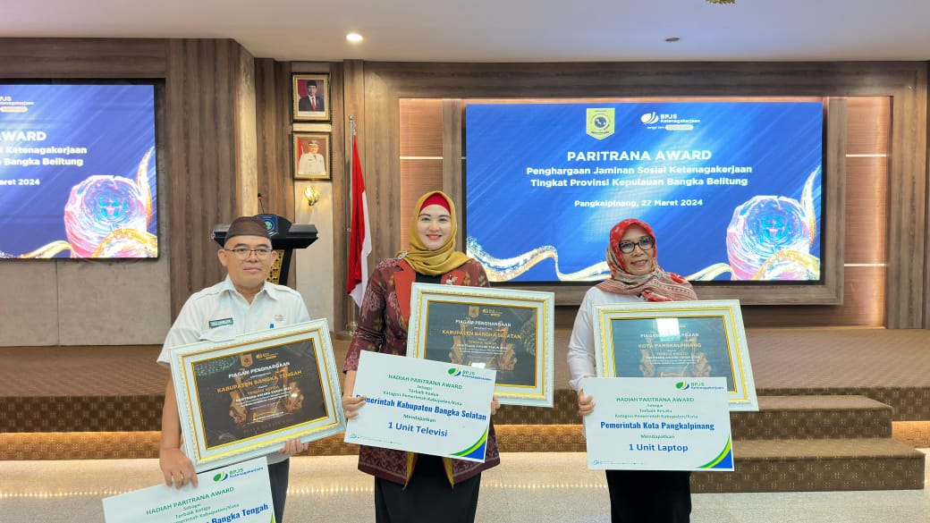 Penyerahan penghargaan tersebut berlangsung di ruang Pasir Padi Kantor Gubernur Kepulauan Bangka Belitung, Kamis (28/03/2024). Penghargaan diserahkan langsung oleh Kepala BPJS Ketenagakerjaan Provinsi Bangka Belitung kepada Wakil Bupati Bangka Selatan, Debby Vita Dewi, Kamis (28/03/2024).