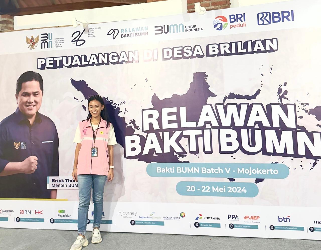 Kementrian BUMN pada bulan April yang lalu membuka seleksi Peserta Program Relawan Bakti BUMN Batch V yang terbuka untuk seluruh pegawai BUMN seluruh Indonesia. Dari ribuan Sobat BUMN yang mendaftar sebanyak 100 Peserta yang terpilih untuk menjadi Relawan dan siap mengikuti rangkaian kegiatan Program Relawan Bakti BUMN Batch V yang akan dilaksankan di 20 – 22 Mei 2024 tersebar di 10 lokasi seluruh Indonesia. Dari 100 peserta terdapat 5 relawan yang mewakil PT PLN (Persrero) dalam kegiatan ini salah satu di antaranya Srikandi PT PLN (Persero) Unit Induk Wilayah (UIW) Babel Prafita Ramadhaniar yang akan menjalani Program Relawan Bakti BUMN di Desa Ketapanrame Mojokerto yang menjadi Desa Wisata Terbaik di Indonesia Anugerah Desa Wisata Indonesia (ADWI) 2023.