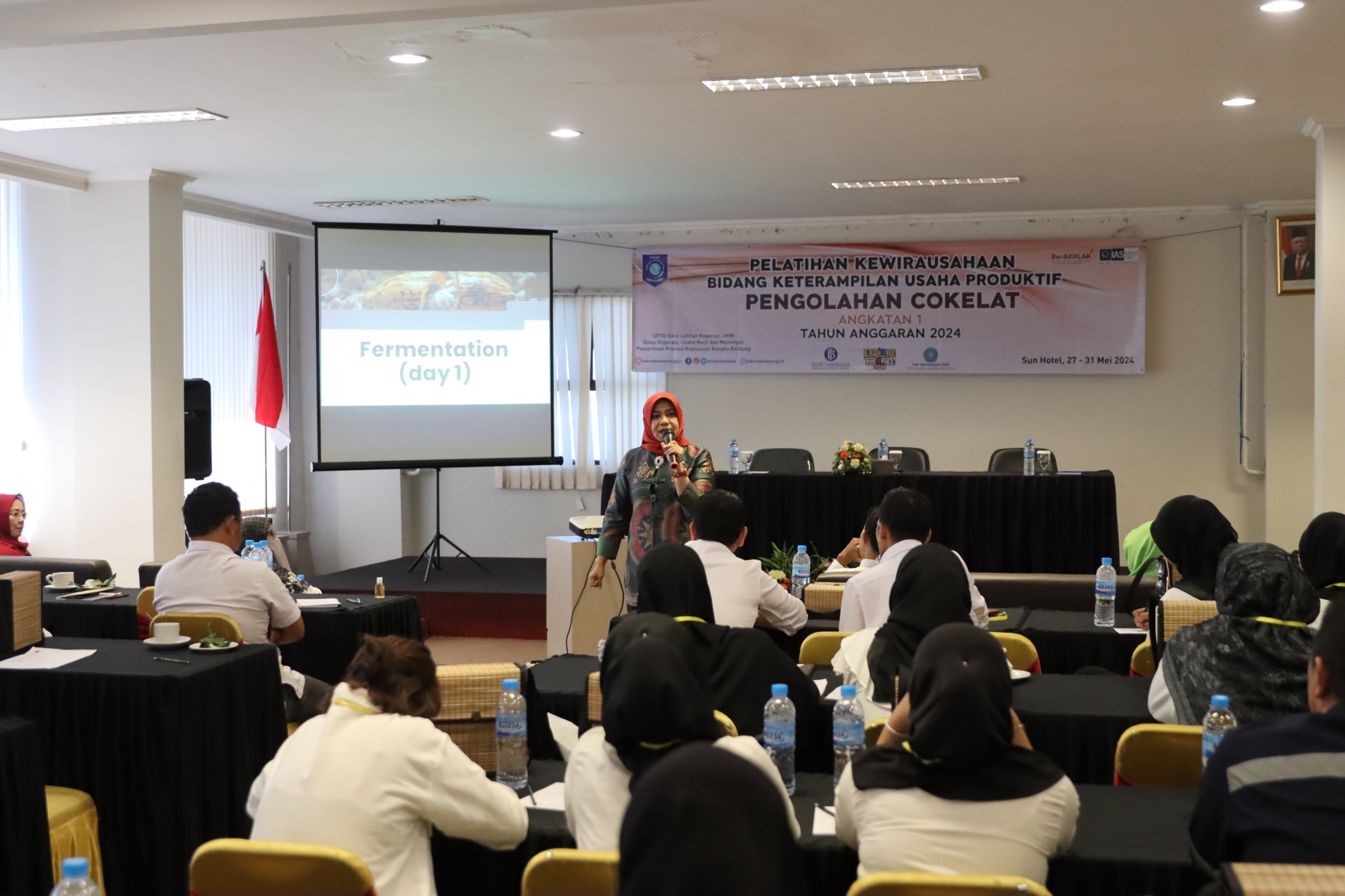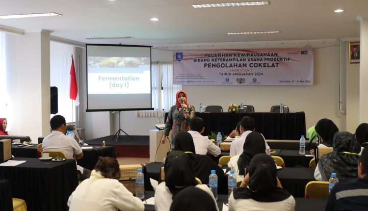 TerabasNews, PANGKALPINANG – Penjabat (Pj) Ketua TP PKK Provinsi Kepulauan Bangka Belitung (Kep. Babel) Saftriati Safrizal menghadiri dan memberikan motivasi pada kegiatan Pelatihan Kewirausahaan Bidang Keterampilan Usaha Produktif Angkatan I Pengolahan Cokelat di Sun Hotel Pangkalpinang pada Senin (27/5/2024).