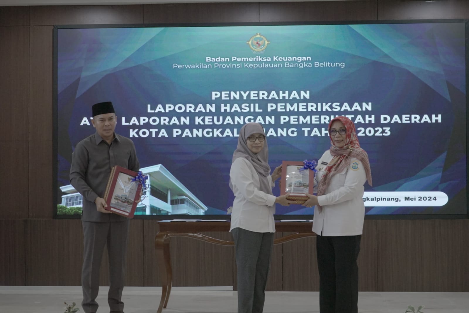 Penyerahan laporan hasil pemeriksaan atas laporan keuangan pemerintah daerah kota Pangkalpinang tahun 2023 dilaksanakan di Auditorium kantor BPK perwakilan Provinsi Bangka Belitung, Rabu (29/05/2024)