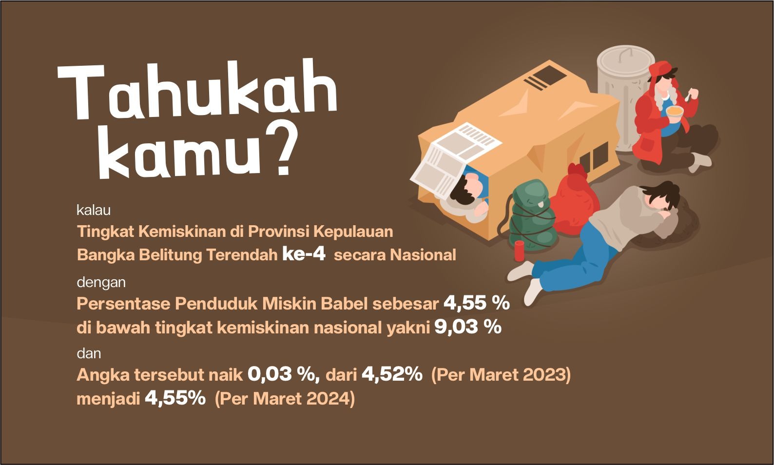 Meskipun angka tersebut naik 0,03 %, dari 4,52% (Per Maret 2023) menjadi 4,55% (Per Maret 2024), namun Persentase penduduk miskin Kep. Babel sebesar 4,55 % ini masih berada di bawah tingkat kemiskinan nasional yakni 9,03 %.