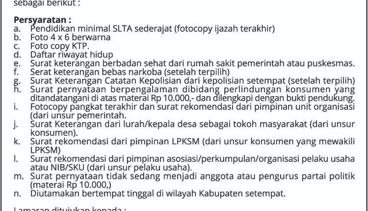 “bagi dibuka lowongan bagi yang tertarik menjadi anggota BPSK dengan mengiktui seleksi berkas dan tertulis,” imbuhnya.