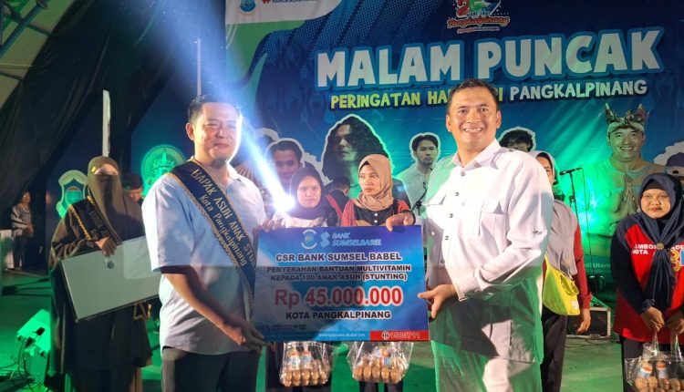 Dalam acara tersebut, Pemimpin Bank Sumsel Babel Cabang Pangkal Pinang di wakili oleh Wakil Kepala Operasional dan Pelayanan BSB cabang Pangkalpinang, Martin Dwista, menyerahkan bantuan Corporate Social Responsibility (CSR) yang ditujukan untuk anak-anak mengalami stunting. “Kami merasa terhormat dipercaya sebagai bapak bunda asuh stunting dan dapat berkontribusi dalam memberikan bantuan CSR sebesar Rp45 juta pada tahap awal ini,” ujar Martin Dwista.