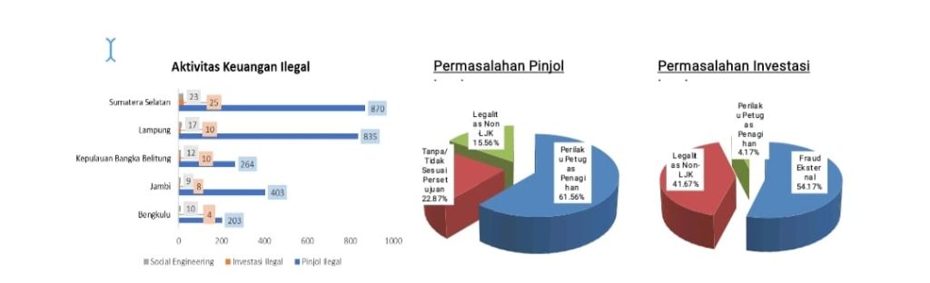 Di sisi pemberantasan aktivitas keuangan ilegal, OJK bersama 15 Kementerian/ Lembaga lainnya dalam forum Satuan Tugas Pemberantasan Aktivitas Keuangan Ilegal (SATGAS PASTI) meningkatkan koordinasi dalam penanganan investasi dan pinjaman online (pinjol) ilegal, termasuk dalam kegiatan pencegahan melalui kegiatan edukasi secara masif. Di wilayah Sumbagsel, per November 2024, terdapat 2.703 layanan konsumen terkait aktivitas keuangan ilegal, didominasi keluhan terkait pinjol ilegal 95,26 persen, social enginering 2,63 persen, dan investasi ilegal 2,11 persen. Untuk pinjol ilegal, pokok permasalahan yang mendominasi adalah Perilaku Petugas Penagihan (61,56 persen), sedangkan pada aktivitas investasi ilegal permasalahan yang mendominasi adalah Fraud Eksternal yang disebabkan penipuan, pembobolan rekening, skimming, atau cyber crime (54,17 persen). Adapun masyarakat yang paling banyak menyampaikan informasi terkait aktivitas pinjol ilegal adalah masyarakat Lampung, sedangkan informasi terkait investasi ilegal dan social engineering adalah masyarakat Sumatera Selatan.