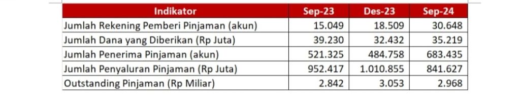 Dalam satu tahun terakhir terjadi peningkatan pada aktivitas financial technology baik dari sisi lender ataupun borrower. Hal ini tercermin dari peningkatan jumlah rekening lender sebesar 103,65 persen (yoy) menjadi 30.648 rekening dan peningkatan jumlah rekening borrower sebesar 31,10 persen (yoy) menjadi 683.435 rekening pada September 2024. Namun demikian, peningkatan jumlah rekening lender dan borrower tersebut, terdapat penurunan pada akumulasi penyaluran pinjaman kepada borrower sebesar 11,63 persen (yoy) menjadi Rp841,63 Miliar, dan akumulasi dana yang diberikan oleh lender sebesar 10,23 persen (yoy) menjadi Rp35,22 Miliar, dengan outstanding pinjaman per September 2024 sebesar Rp2,97 triliun.