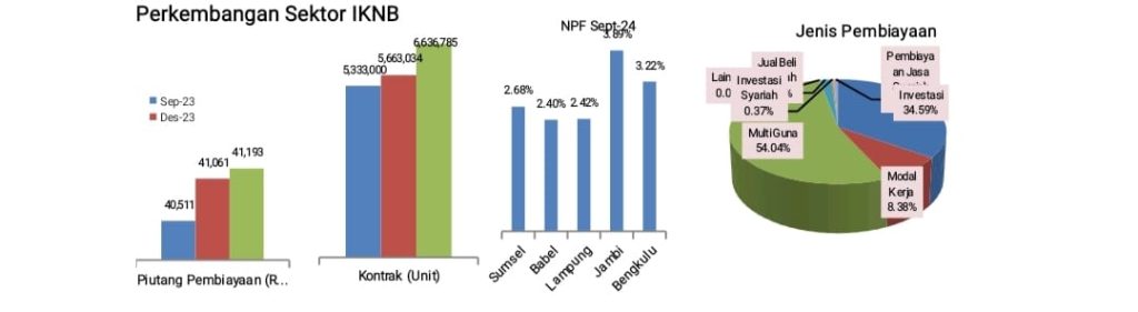 Pada sektor IKNB posisi September 2024, nilai piutang pembiayaan di Sumbagsel mencapai Rp41,19 triliun, meningkat 1,68 persen (yoy), dan dari sisi jumlah kontrak mengalami peningkatan 24,45 persen menjadi 6,64 juta unit. Adapun rasio Non Performing Financing (NPF) di wilayah Sumbagsel masih terjaga pada range angka terendah 2,90 persen dan angka tertinggi 3,89 persen di provinsi Jambi. Jenis pembiayaan yang disalurkan didominasi oleh Pembiayaan Multi Guna, disusul Pembiayaan Investasi, dan Pembiayaan Modal Kerja.