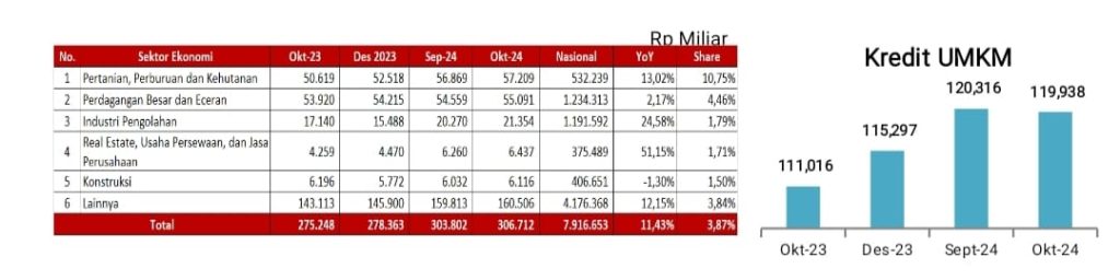 Kredit/pembiayaan posisi Oktober 2024 didominasi oleh Sektor Pertanian, Perburuan, dan Kehutanan sebesar Rp57,21 triliun meningkat 13,02 persen (yoy) dengan market share 10,75 persen dari kredit/pembiayaan nasional pada sektor yang sama. Namun pertumbuhan tertinggi terjadi pada sektor ekonomi Real Estate, Usaha Persewaan, dan Jasa Perusahaan yakni meningkat 51,15 persen menjadi Rp6,44 triliun. Selanjutnya, dalam mendukung permodalan UMKM, shared penyaluran kredit/pembiayaan kepada UMKM mencapai Rp119,94 triliun atau 39,10 persen dari total penyaluran kredit di Sumbagsel, tumbuh 8,04 persen (yoy) dan di atas target minimal porsi penyaluran kredit/pembiayaan UMKM.