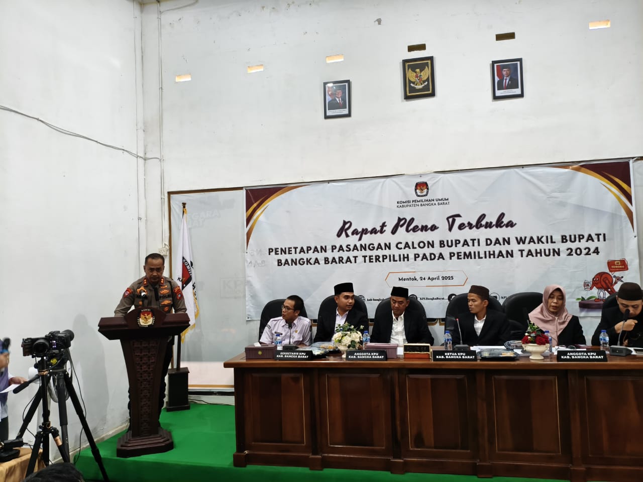 TerabasNews, Bangka Barat – Dalam suasana penuh khidmat dan kondusif, Rapat Pleno Terbuka Penetapan Pasangan Calon Bupati dan Wakil Bupati Terpilih Kabupaten Bangka Barat pada Pilkada 2024 digelar oleh Komisi Pemilihan Umum (KPU) Bangka Barat, Kamis (24/4/2025), bertempat di Ruang Rapat KPU setempat.