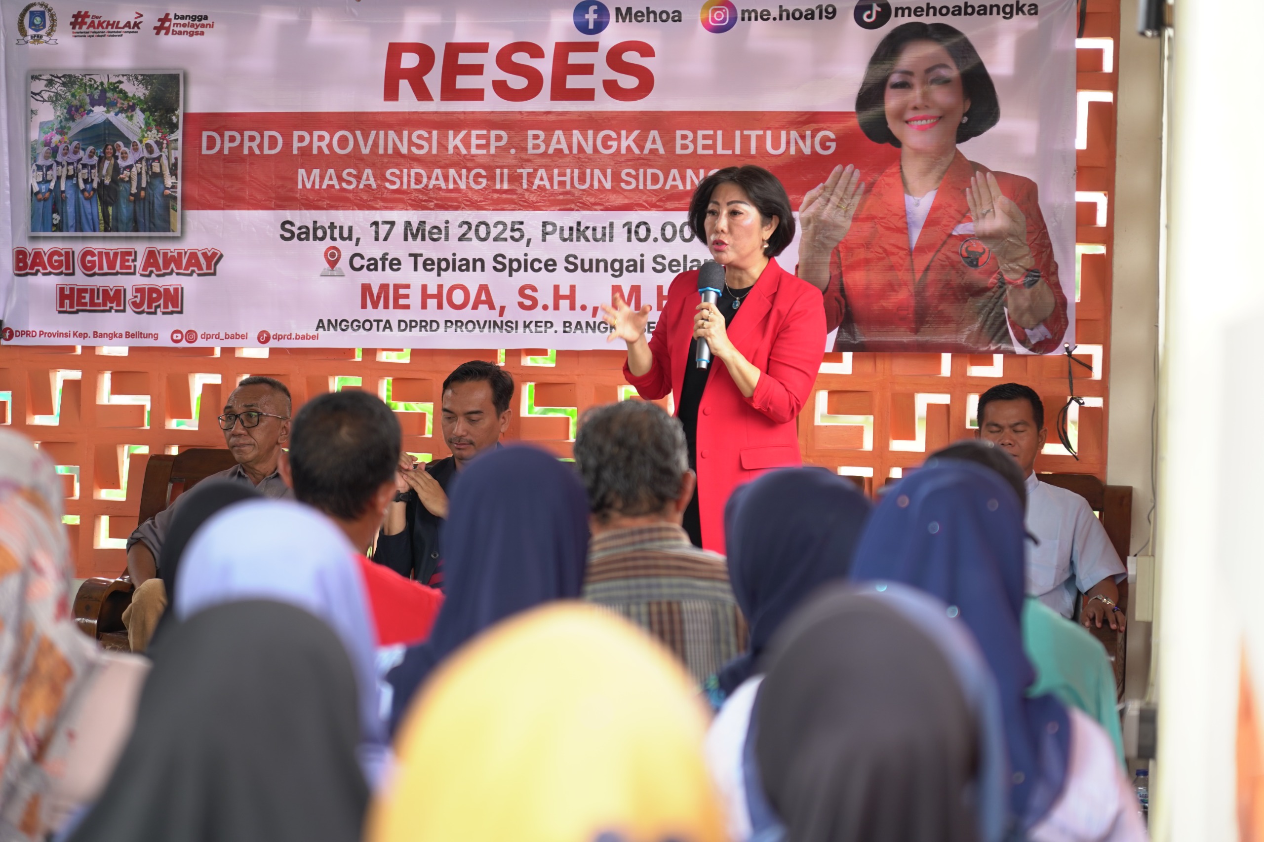 Dalam kesempatan itu, Mehoa yang didampingi Kasat Lantas Polres Bangka Tengah, Dinas Pendidikan dan Dinas kesehatan Provinsi Bangka Belitung menyampaikan bahwa reses masa sidang II tahun sidang I tersebut bertujuan untuk mendengarkan aspirasi dari pada warga yang ada di wilayah kecamatan Sungaiselan.