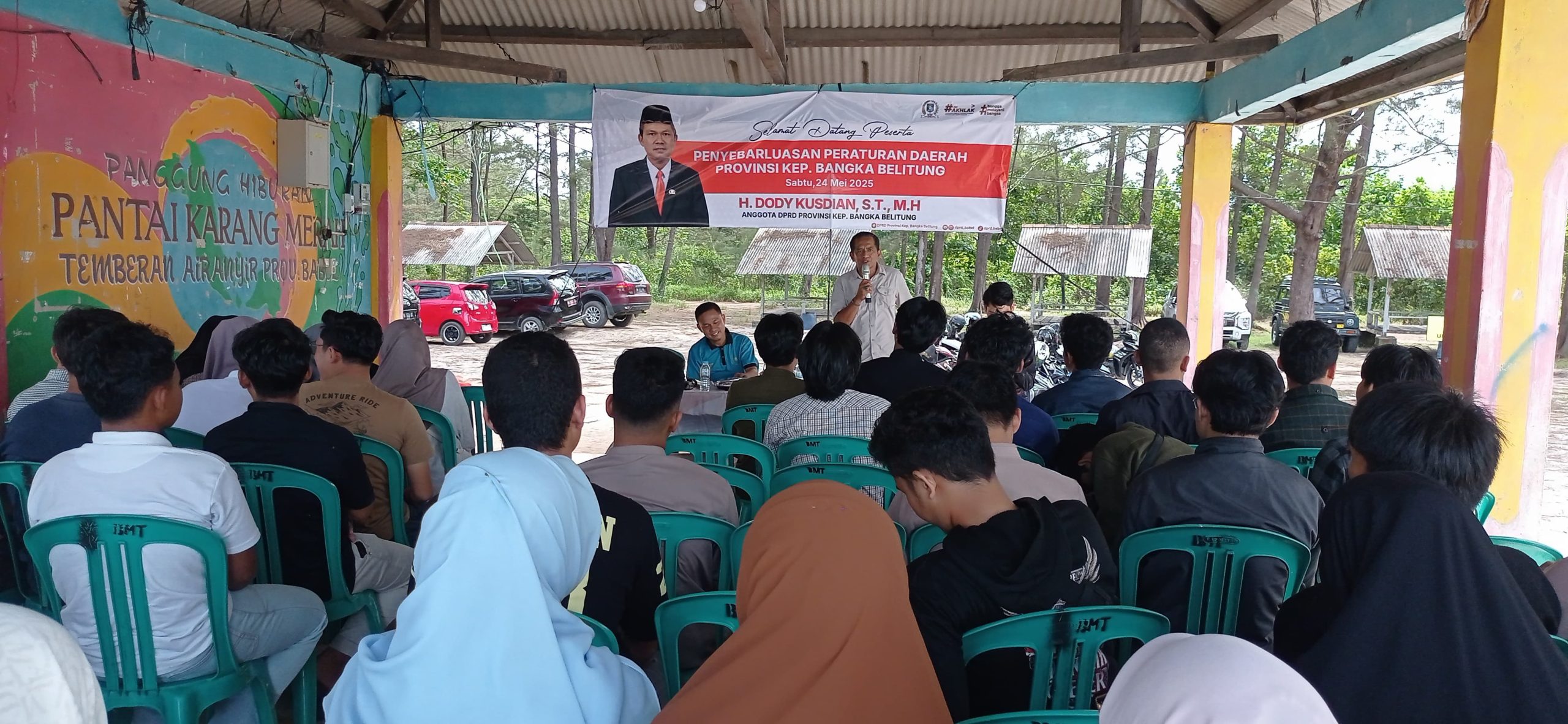 TerabasNews, Merawang – Dalam semilir angin pantai Temberan, Desa Air Anyir, Kabupaten Bangka, Sabtu (24/05/2025), Ketua Komisi II DPRD Provinsi Kepulauan Bangka Belitung, Dody Kusdian mensosialisasikan Peraturan Daerah (Perda) Nomor 13 Tahun 2016 tentang Keolahragaan kepada mahasiswa dan masyarakat.