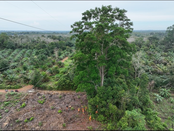Posisi pohon sangat dekat dengan jaringan Transmisi SUTT 150 kV jalur Koba-Toboali. Untuk menjaga Keselamatan Ketenaglistrikan (K2), PLN bersama masyarakat melakukan pembersihan pohon. (Foto. Ist)