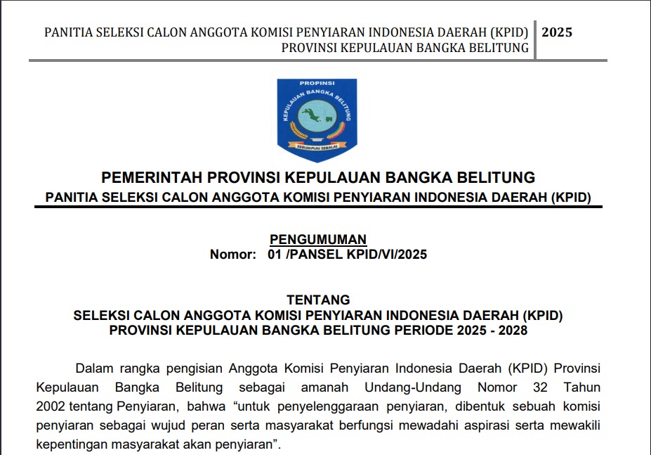 Pembukaan seleksi dilaksanakan seiring diterbitkannya pengumuman Nomor 01/PANSEL KPID/VI/2025, tentang Seleksi Calon Anggota Komisi Penyiaran Indonesia Daerah (KPID) Babel periode 2025-2028, sebagai amanah Undang-Undang Nomor 32 Tahun 2002 tentang Penyiaran.