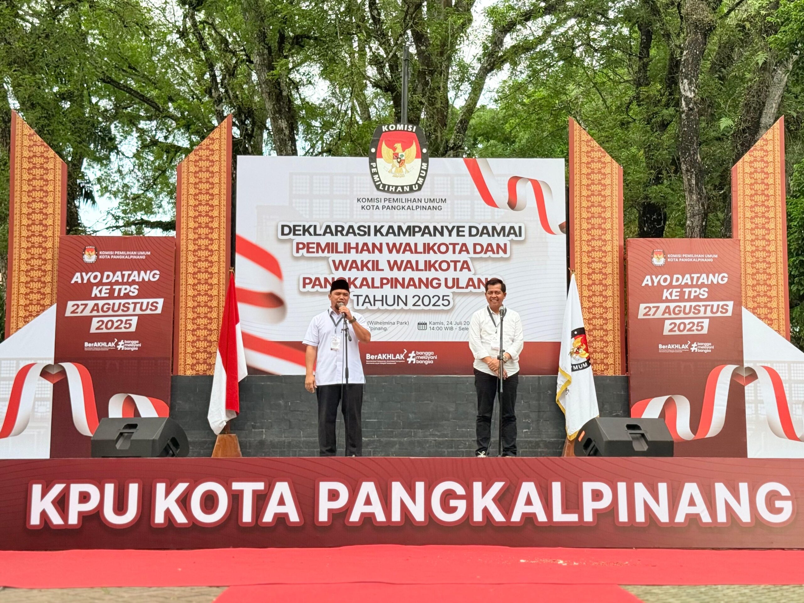 TerabasNews, Pangkalpinang – Pasangan calon wali kota dan calon wakil wali kota nomor urut 4, Basit Cinda-Dede Purnama Alzulami menghadiri Deklarasi Kampanye Damai Pilkada Ulang Kota Pangkalpinang 2025, di Taman Wilhelmina, Tamansari, Pangkalpinang, Kamis, 24 Juli 2025.