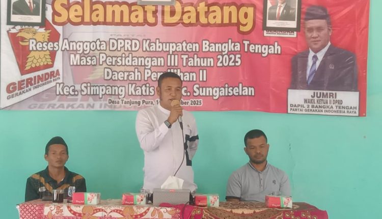 TerabasNews, BANGKA TENGAH – Jumri Wakil Ketua II DPRD Bangka Tengah, yang dikenal sebagai sosok yang merakyat dan dekat dengan semua kalangan, kembali menunjukkan komitmennya untuk melayani dengan sepenuh hati, dengan menggelar reses di Desa Tanjung Pura.