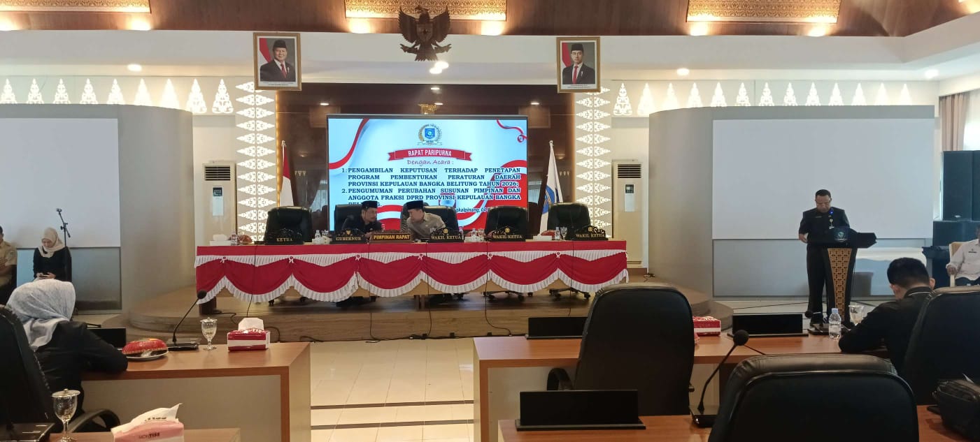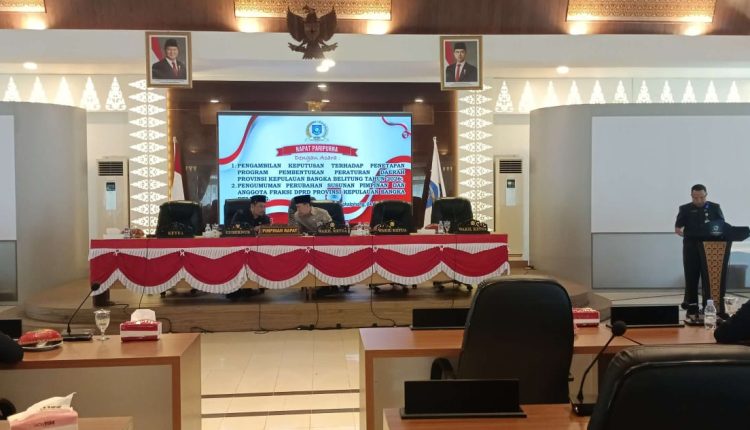 TerabasNews, PANGKALPINANG – Rapat Paripurna Dewan Perwakilan Rakyat Daerah (DPRD) Provinsi Kepulauan Bangka Belitung yang digelar pada Selasa (4/11/2025) mengalami penundaan untuk dua agenda penting, yakni Penetapan Program Pembentukan Peraturan Daerah (Propemperda) Tahun 2026 dan Perubahan Susunan Pimpinan dan Anggota Fraksi Demokrat Kebangkitan Bangsa (FDKB).