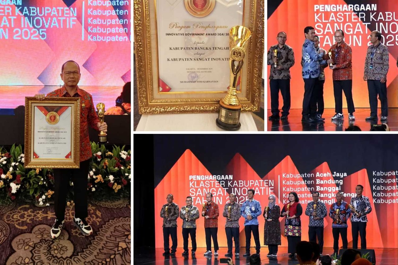 TerabasNews, JAKARTA – Pemerintah Kabupaten Bangka Tengah kembali menorehkan pencapaian membanggakan di tingkat nasional. Pada penghujung tahun 2025, Pemerintah Kabupaten Bangka Tengah resmi meraih predikat Kabupaten Sangat Inovatif dalam ajang Innovative Government Award (IGA) 2025 yang diselenggarakan oleh Kementerian Dalam Negeri Republik Indonesia. Penghargaan tersebut diserahkan di Kempinski Grand Ballroom Hotel, Jakarta Pusat pada Rabu (10/12/2025).
