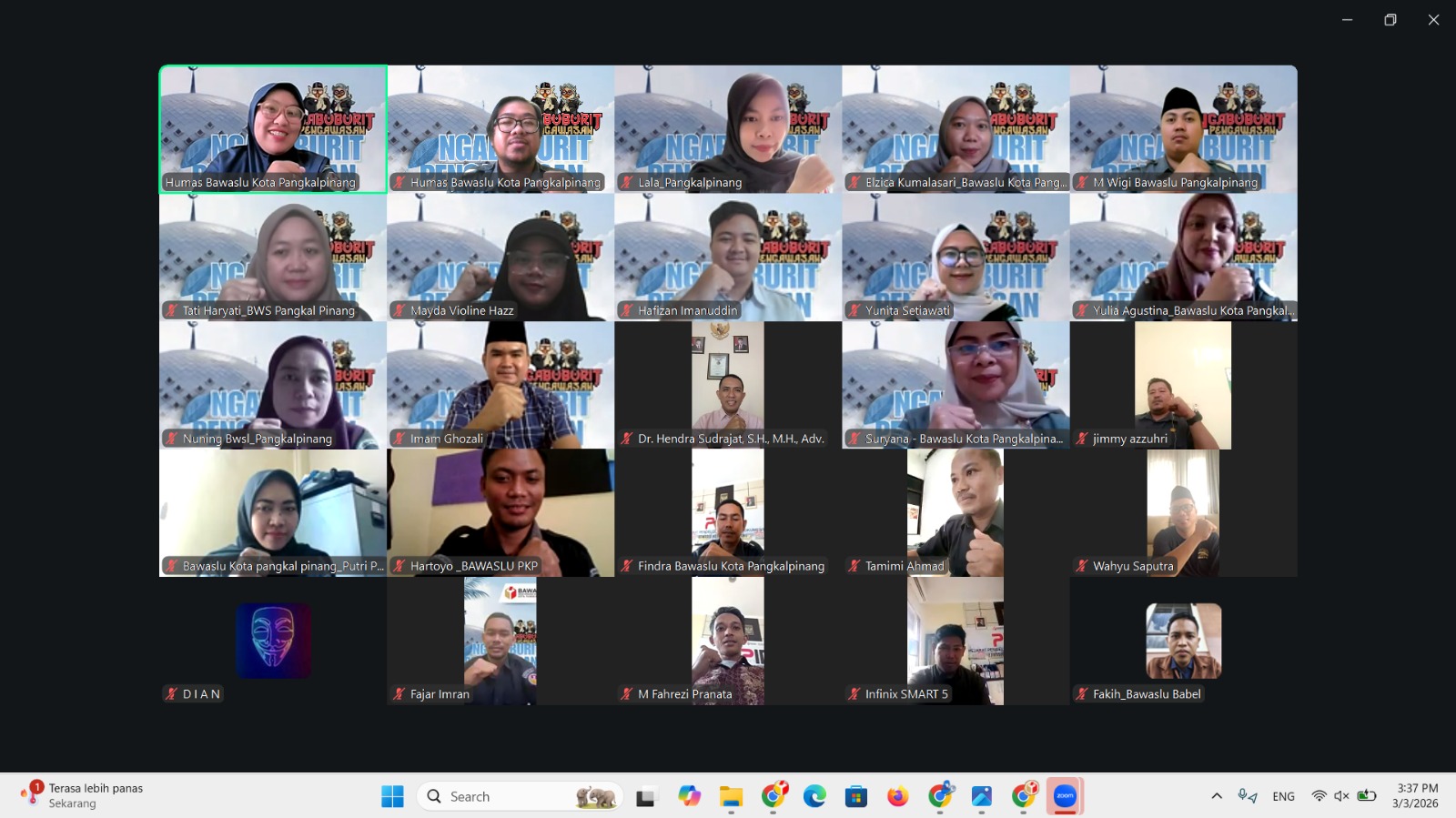 Kegiatan yang berlangsung melalui Zoom tersebut diikuti jajaran pimpinan dan staf Bawaslu Kota Pangkalpinang, perwakilan Bawaslu Provinsi Kepulauan Bangka Belitung, serta peserta dari berbagai daerah.