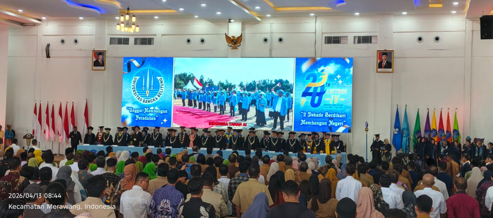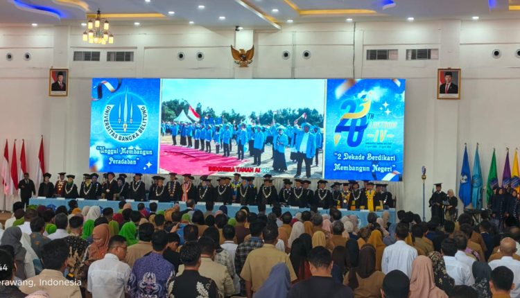 TerabasNews, BALUNIJUK – Universitas Bangka Belitung (UBB) menggelar peringatan Dies Natalis ke-20 bersamaan dengan upacara pengukuhan tiga orang Guru Besar di Balai Utama De Universitaria Kampus Terpadu UBB, Desa Balunijuk, Kecamatan Merawang, Kabupaten Bangka, pada Senin (13/4/2026). Kegiatan ini mengusung tema “2 Dekade Berdikari Membangun Negeri”.